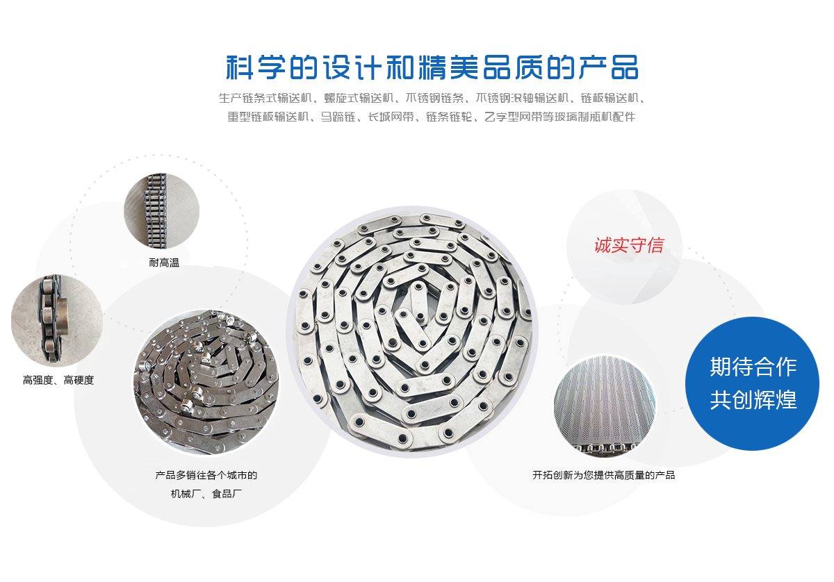 生產(chǎn)鏈條式輸送機(jī)、螺旋式輸送機(jī)、不銹鋼鏈條、不銹鋼滾軸輸送機(jī)、鏈板輸送機(jī)、重型鏈板輸送機(jī)、馬蹄鏈、長(zhǎng)城網(wǎng)帶、鏈條鏈輪、乙字型網(wǎng)帶等玻璃制瓶機(jī)配件,食品機(jī)械配件及各種網(wǎng)帶的專業(yè)廠家 ,多年來產(chǎn)品暢銷各地玻璃廠和食品廠,在玻璃制品等行業(yè)中享有較高的聲譽(yù)。公司集摸具開發(fā)、機(jī)械設(shè)計(jì)生產(chǎn),銷售于一體的生產(chǎn)型企業(yè)。生產(chǎn)的自動(dòng)化流水線金屬傳動(dòng)網(wǎng)帶、鏈條等產(chǎn)品廣泛用于玻璃機(jī)械、食品機(jī)械、化纖機(jī)械、醫(yī)藥、電子、烘干機(jī)械、輪胎機(jī)械等行業(yè)。產(chǎn)品多銷往各個(gè)城市的機(jī)械廠、食品廠和一些涉及流水線或自動(dòng)化設(shè)備的公司。